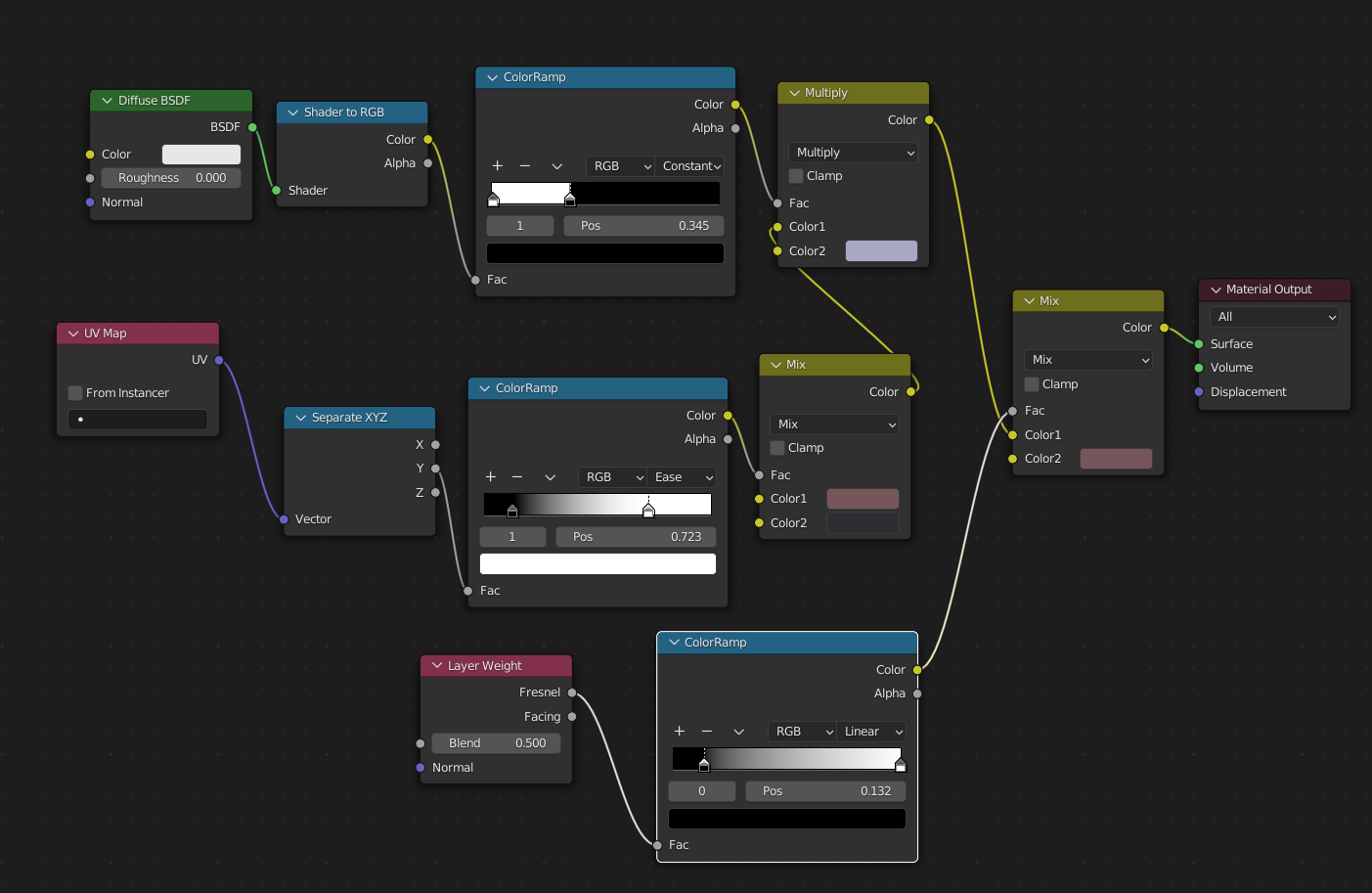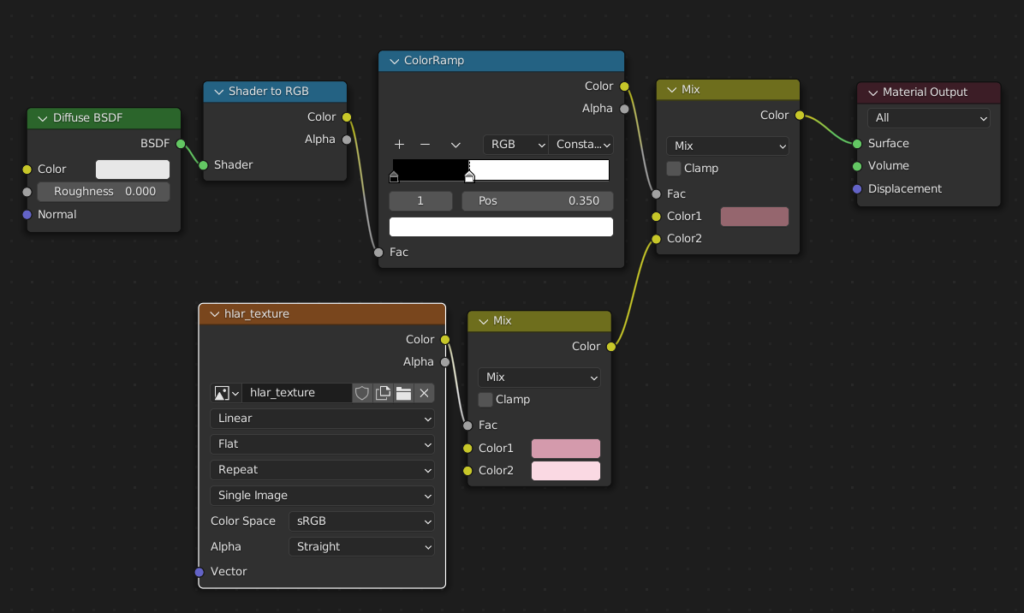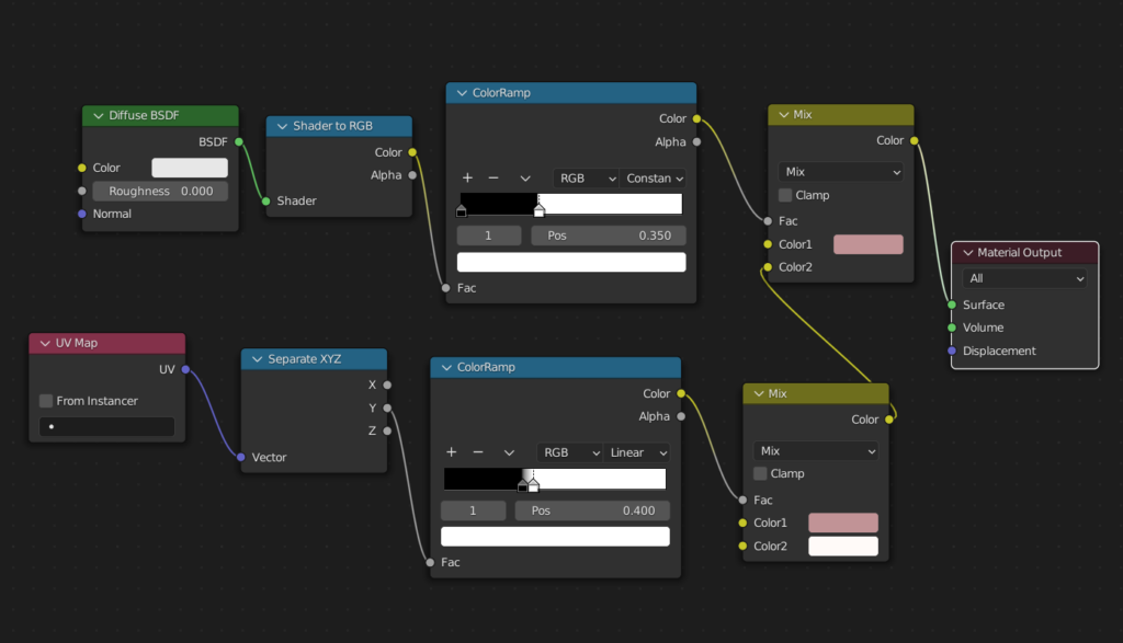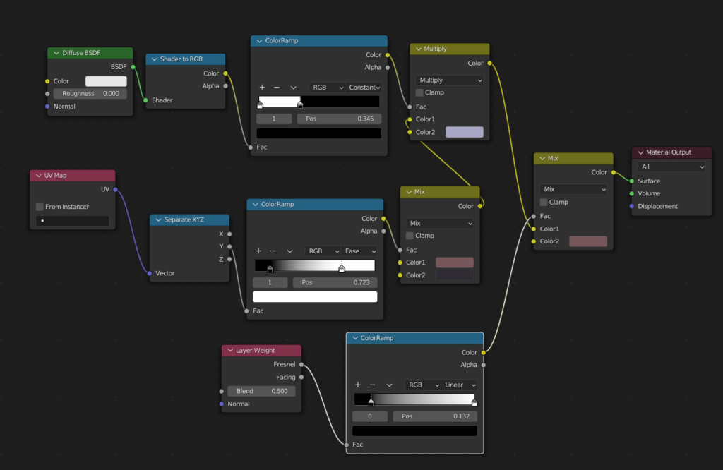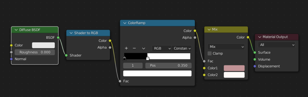 オブジェクトの陰影をColorRampで2値化してMix RGBで色分けする。