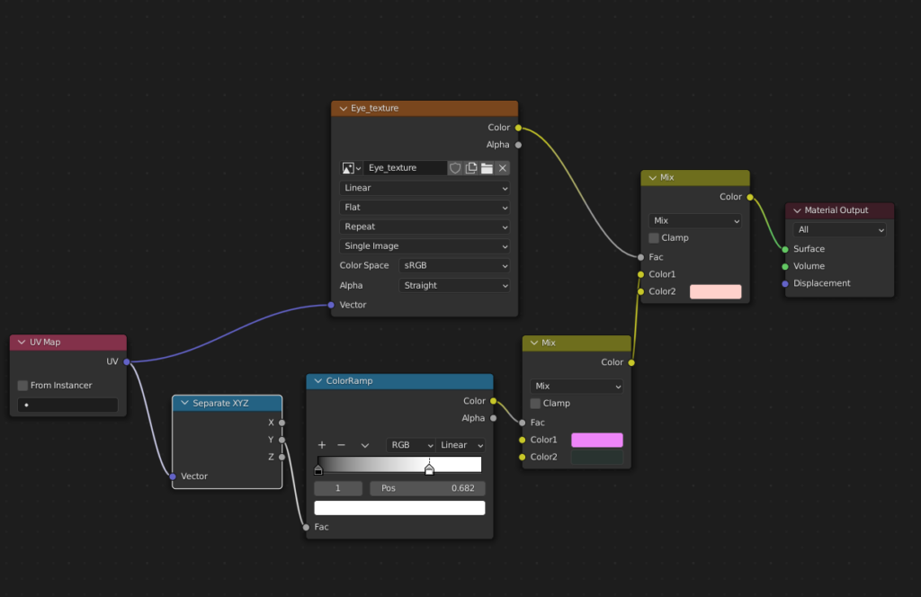 目などハイライト部分とそれ以外みたいな感じで2色の塗り分けをテクスチャを仕様しつつ、MixRGBで色設定する方法。グラデーションも適応する。