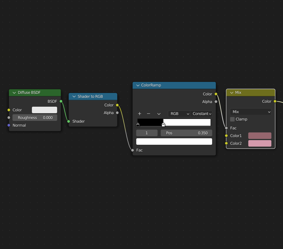 - ColorRampとMixRGBの接続をFacに変更。MixRGBのColor1とColor2で基本色と影色を設定。